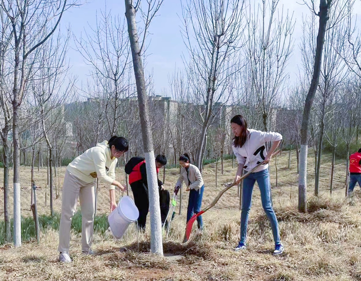 师生各司其职,认真地挥动铁锹,扶正树苗,填土踩实,提桶浇水,植树现场一片繁忙。
