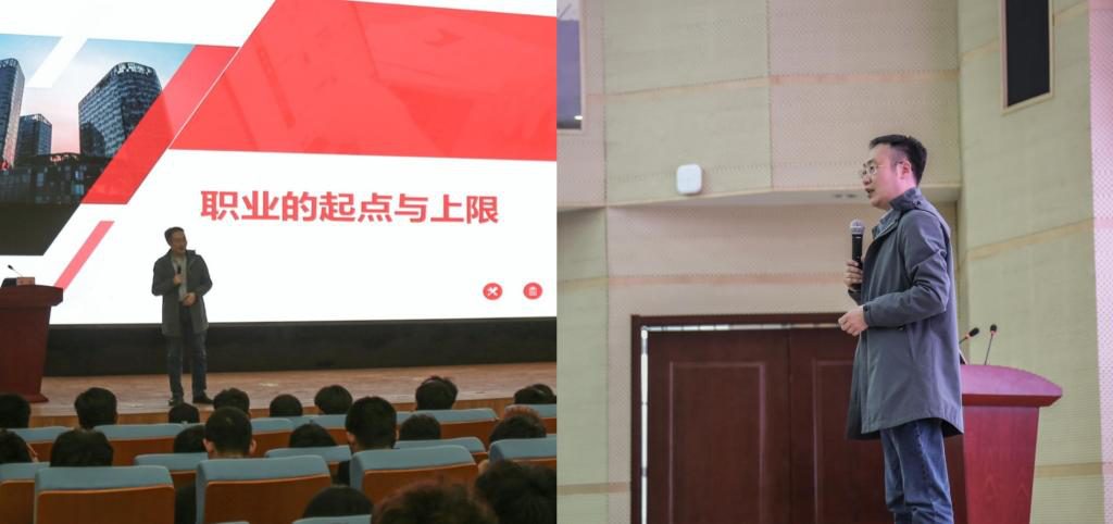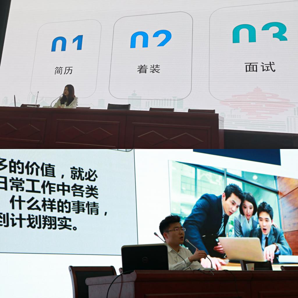 3月30日,活动邀请到华清远见集团副总裁兼山东分公司总经理李鹏做专题讲座。李鹏以《职业的起点与上限》为题,从“追梦”入手,用生动形象的例子为大家讲述了身边的励志故事。他认为在追梦路上一定要坚持“要”的态度:要去的地方、要做的事情一开始就要确定下来,只有清楚了自己想要什么,才能真正地去追逐梦想,创造未来。专业基础、学习习惯、礼貌素养、专业证书、动手能力以及表达能力是一名求职者应具备的基本素质,同学们应努力增强自身的各种技能,争取早日成长成才。