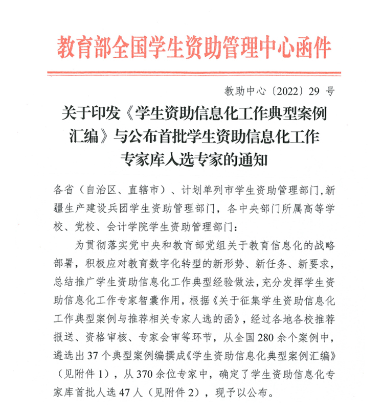近日,教育部全国学生资助管理中心下发《关于印发<学生资助信息化工作典型案例汇编>与公布首批学生资助信息化工作专家库入选专家的通知》(教助中心〔2022〕29号),伟德《用信息化推动资助工作“有的放矢”》案例成功入选,学生工作处王宁入选专家库。