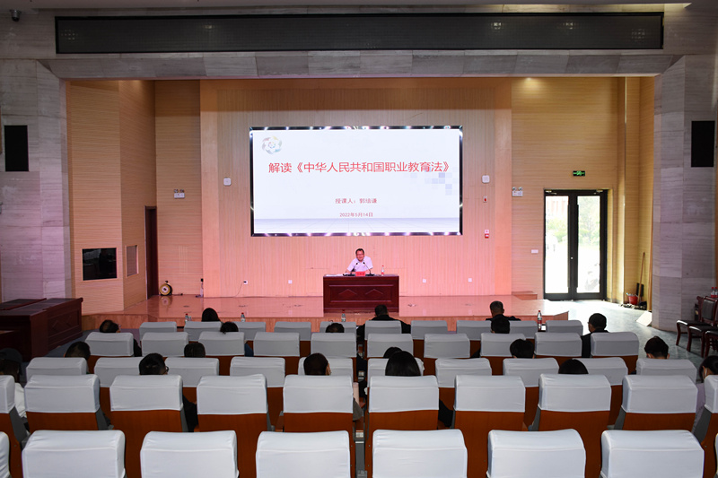 5月14日下午,党委副书记郭培谦在图书行政楼东报告厅以《解读<中华人民共和国职业教育法>》为题讲授党课。学工第一临时党支部、学工第二临时党支部党员参加。