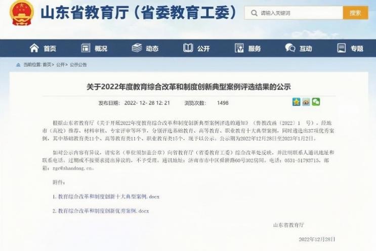 山东省教育厅组织开展的2022年度全省教育系统教育综合改革和制度创新案例征集评选活动,旨在全面展示我省2022年度教育综合改革和制度创新的成果,系统推进、持续深化教育综合改革。经过严格、审慎的征集评审,分别评出基础教育、高等教育、职业教育十大典型案例,并评出优秀案例37项。