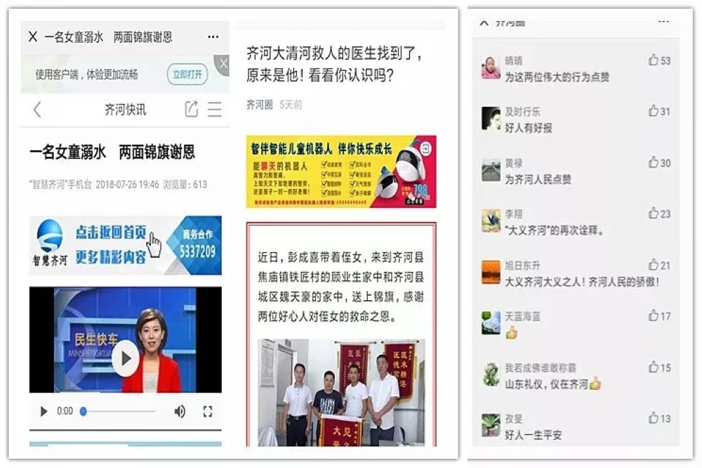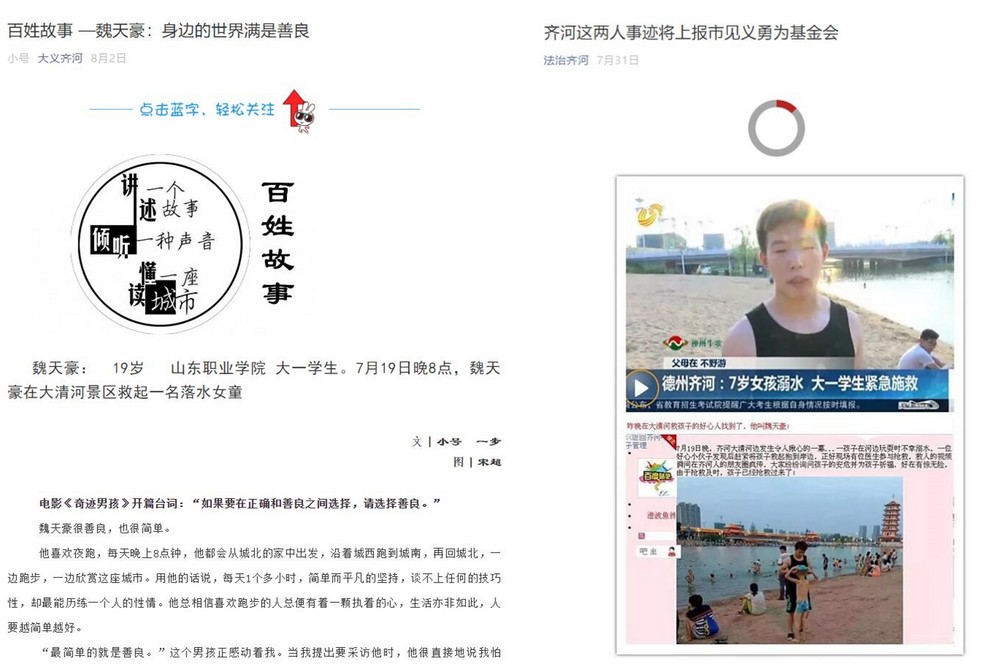 魏天豪见义勇为救溺水儿童的大爱善举在暑假期间也传遍家乡齐河,各级新闻媒体、微信圈纷纷关注予以宣传报道,赢得了社会各界的广泛赞誉。齐河县委宣传部认证的微信公众号“大义齐河”这样评价魏天豪:最简单的就是善良。用发现美的眼光看待这个世界,用自己的善良感知这个世界,这就是魏天豪的本性。一座城市的灵魂,不仅在于高楼大厦和车水马龙,更在于集体的记忆和共同的气质。当这些东西历经数年,缓慢地积淀,不动声色地萦绕在我们身边,影响着人们的一言一行,成为共同的价值趋向。“身边的世界满是善良”,这就是这座城市一次次温暖我们的原因。