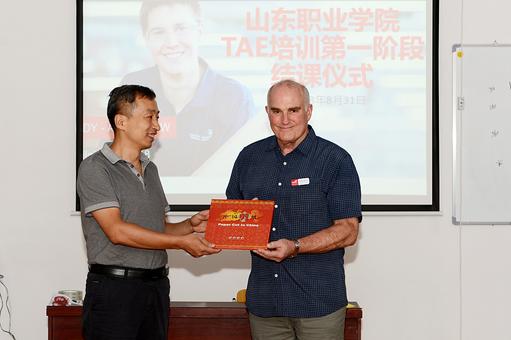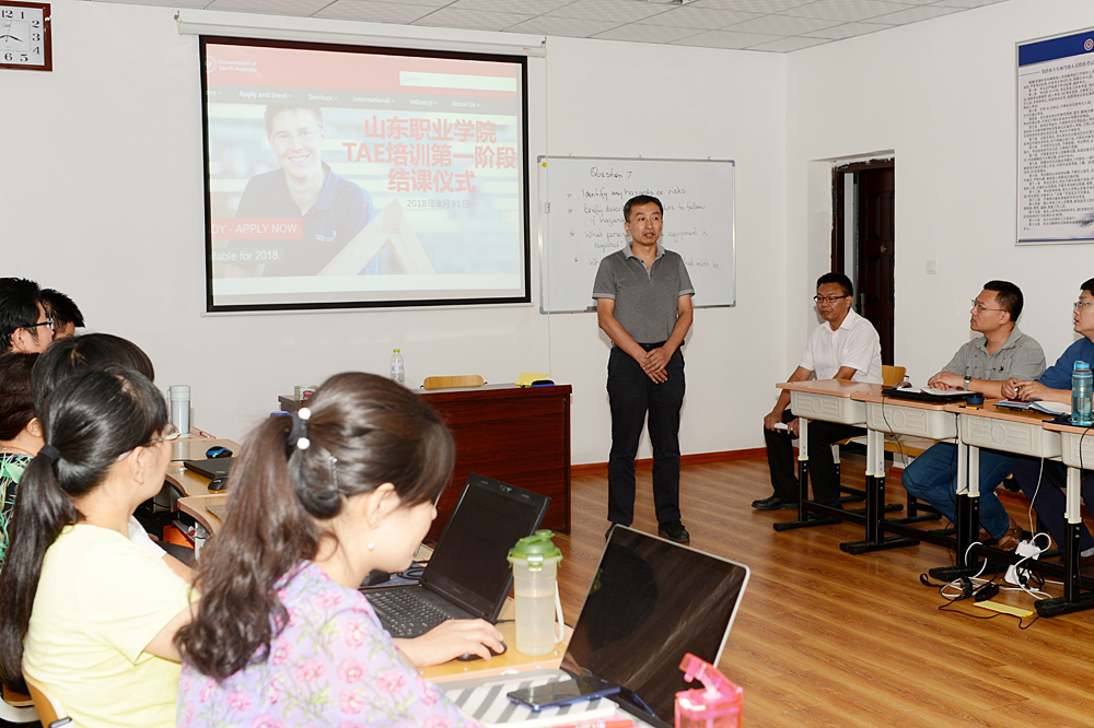 近日,我院澳大利亚TAE IV教师培训第一阶段面对面授课顺利结束。副院长郭鹏出席结课仪式,代表学院向澳方培训讲师赠送纪念品并作总结讲话。参加培训的教师代表李伟介绍了培训体会,南澳州职业技术学院(TAFE SA)皮特格林先生(Peter Green)对我院教师的学习给予了充分的肯定。