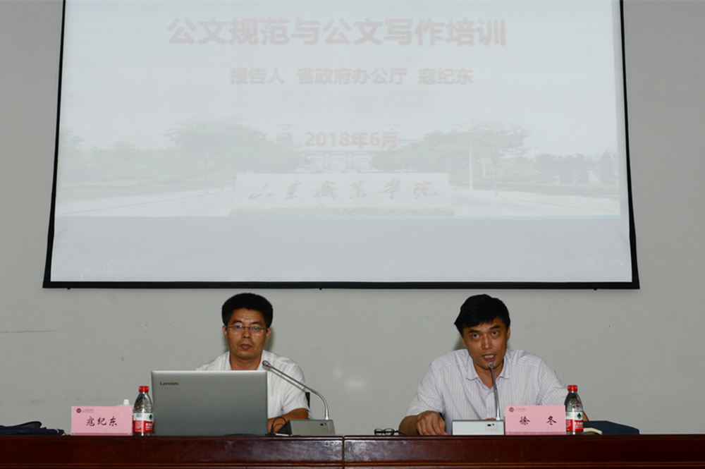 为进一步提高学院公文规范化和文字水平,推动文风转变,提升工作效率和管理水平,6月28日下午,我院举办公文规范与公文写作培训,邀请省政府办公厅副调研员寇纪东作专题培训。学院党委副书记徐冬主持活动,全院副科级及以上干部、各处室(系部)无值守任务的管理人员、辅导员等参加培训。