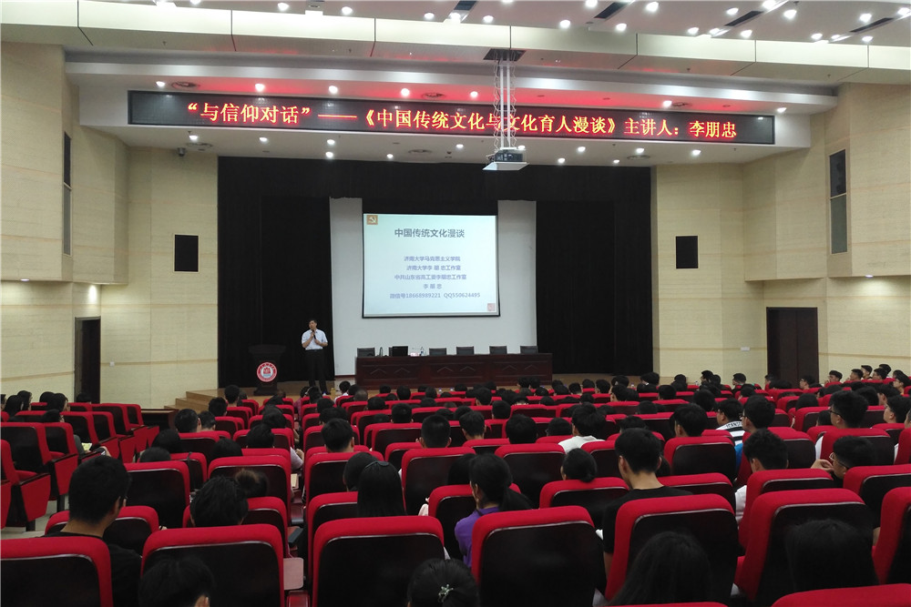 6月7日,由学院团委、学生处举办的“与信仰对话---中国传统文化漫谈”主题讲座在图书行政楼西报告厅举行,知名学者、济南大学马克思主义学院李朋忠教授主讲,副院长祝瑞花与现场近400名师生共同聆听了讲座。