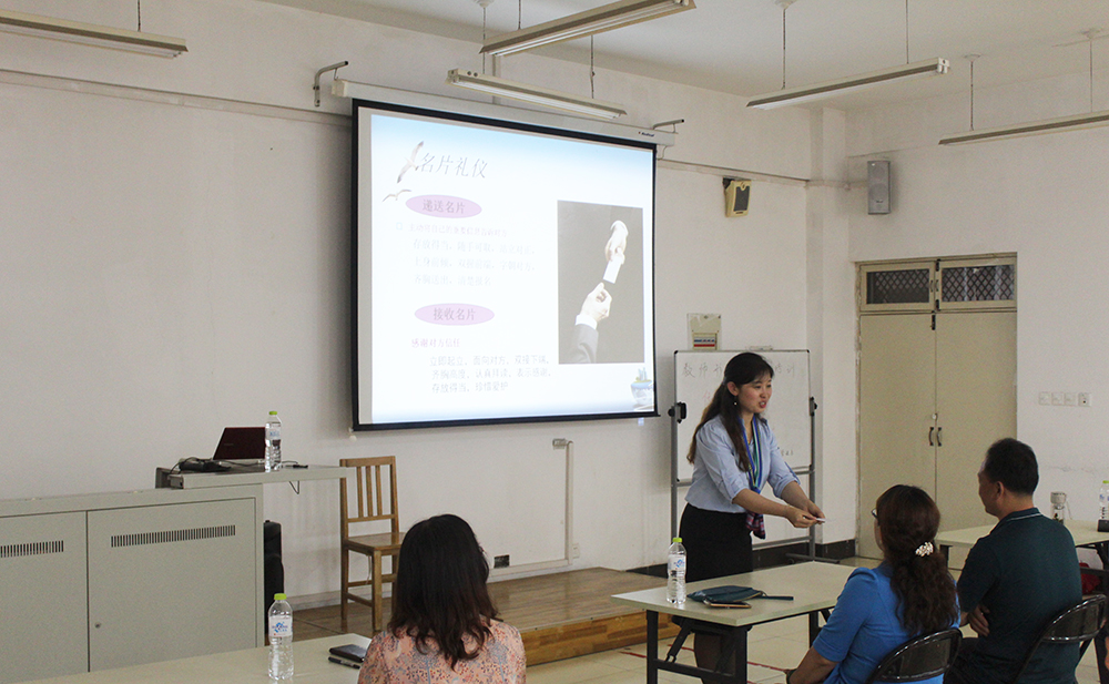 传承美仪,从心识礼。近日,学院工会组织举办了教师形象礼仪培训活动,聘请山东旅游职业学院辛冰老师担任主讲。铁道运输与财经管理系承办培训活动。辛冰给师生们阐述了开展礼仪教育的重要性,讲解了不同场合的不同礼仪知识,示范了在不同场合的不同礼仪姿态。通过培训,老师们对礼仪重要性有了更加深刻认识,对不同场合的礼仪规范了有了进一步的了解。