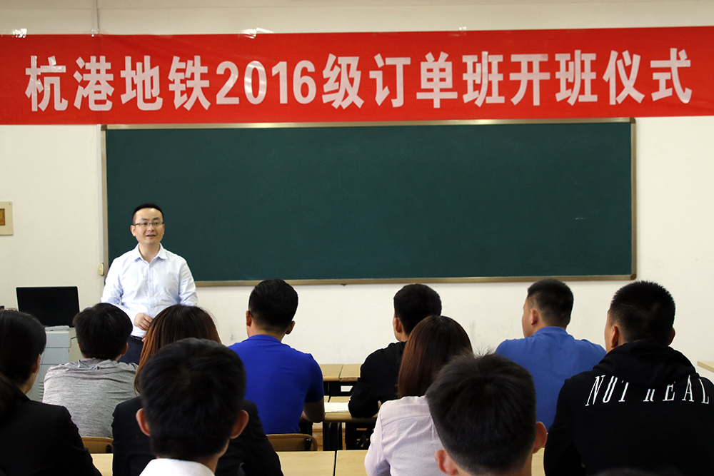 八、校企合作,发挥优势特色,助力轨道交通发展。5月8日,杭港地铁有限公司人力资源部经理贾尚斌、主任沈建龙一行到访学院,洽谈校企合作事宜,签署合作协议,举行2016级订单班开班仪式。学院党委副书记徐冬出席洽谈会,招生就业处处长张少飞、城市轨道交通系主任王绍军、副主任张风琴参加会议。在2016级订单班开班仪式,贾尚斌、沈建龙为订单班学生介绍了杭港地铁有限公司及杭港地铁建设规划基本情况,对同学们在校期间的学习生活提出要求,并就同学们关心的实习工作进行了答疑解惑,希望大家刻苦努力,稳扎稳打,培养严谨的态度和积极向上的精神风貌,在今后的工作岗位上取得骄人成绩。