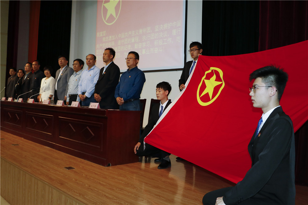 随后,在现场400余名新老团员的见证和祝福下,出席仪式的领导、老师为新团员代表颁发团员证,并亲手将崭新的团徽佩戴到新团员胸前。铁道供电与电气工程系团总支副书记宁阳同学带领全体新团员面对鲜艳的团旗庄严宣誓,老团员、团干部与新团员一同重温入团誓词,表达“不忘初心跟党走”的决心和信念。