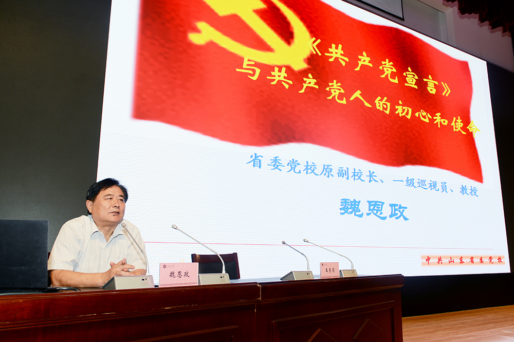 读书班上,省委党校原副校长、教授、硕士研究生导师魏恩政教授作了题为《〈共产党宣言〉与共产党人的初心和使命》的专题报告。报告主题鲜明,思想深刻,内涵丰富,具有很强的针对性、指导性、启发性,为即将开展的“不忘初心、牢记使命”主题教育进行了预热。