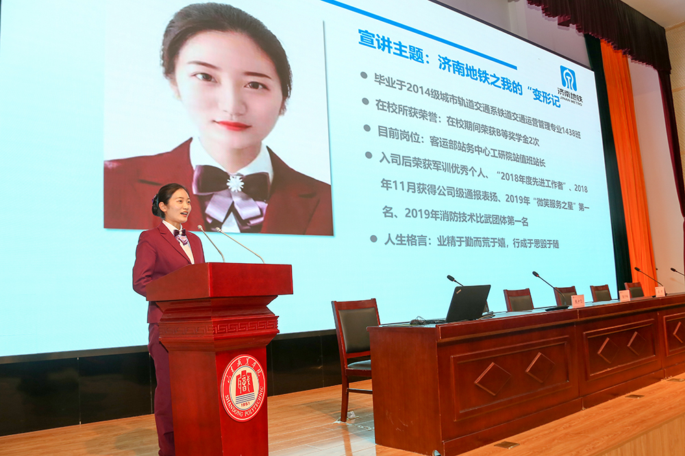 济南轨道交通集团运营公司副总经理赵白雪、学院院长秦河、学院党委副书记徐冬、招生就业处处长张少飞出席活动。济南轨道交通集团运营公司办公室宣传主管张子枫通过视频、PPT等形式,以“安全地铁、绿色地铁、智慧地铁、品质地铁”为主题,详细诠释了企业理念与企业文化。学院往届毕业生优秀员工代表作了经验分享交流。2017级、2018级济南地铁订单班全体学生参加活动。