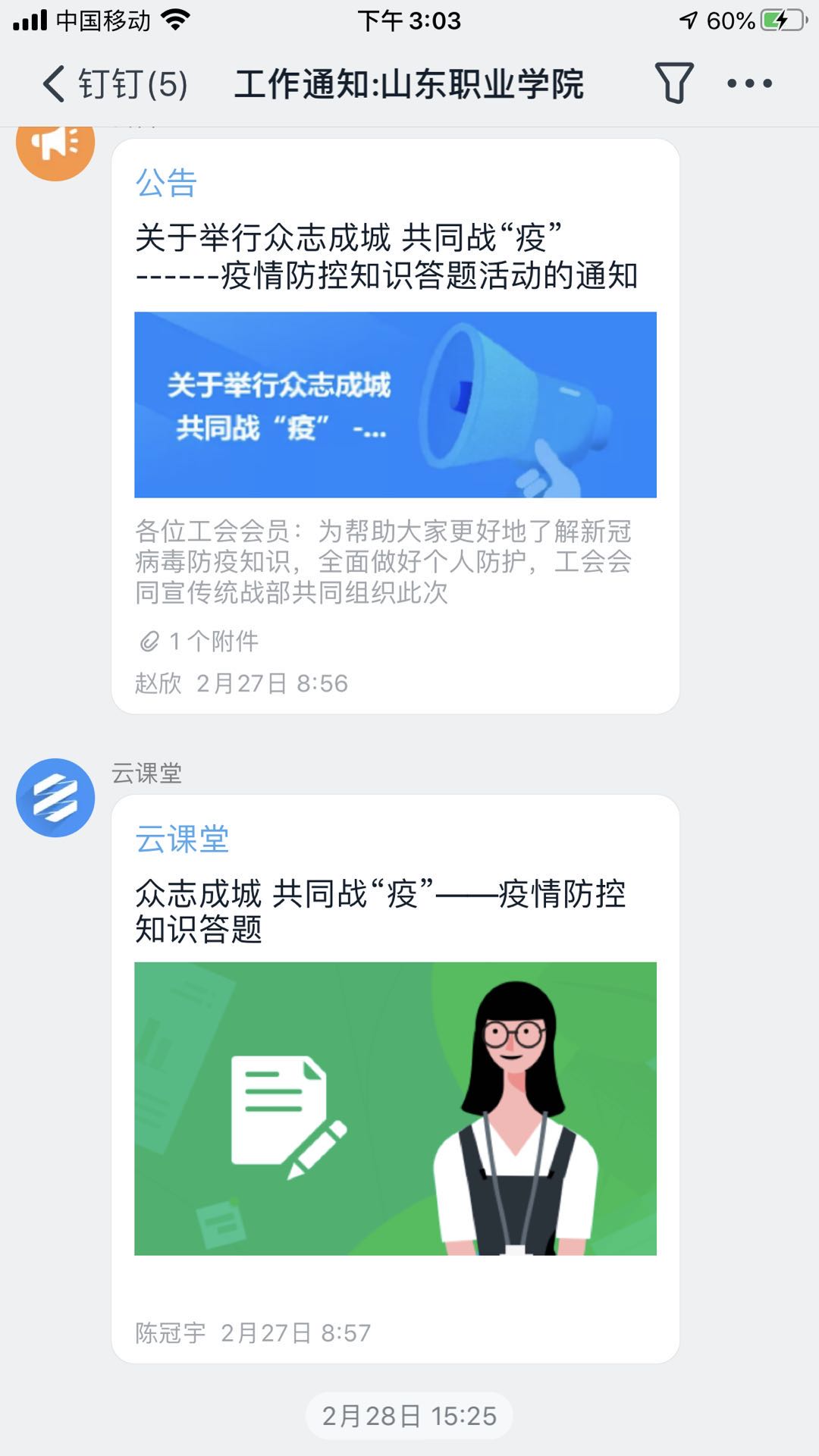 为进一步扎实做好学院新冠肺炎疫情防控工作,引导全体教职工学习防疫知识、提高防疫意识、加强自我防护、消除恐慌心理,2月27日至3月2日,工会联合宣传统战部创新学习模式,首次通过钉钉工作平台开展了疫情防控知识线上答题活动。