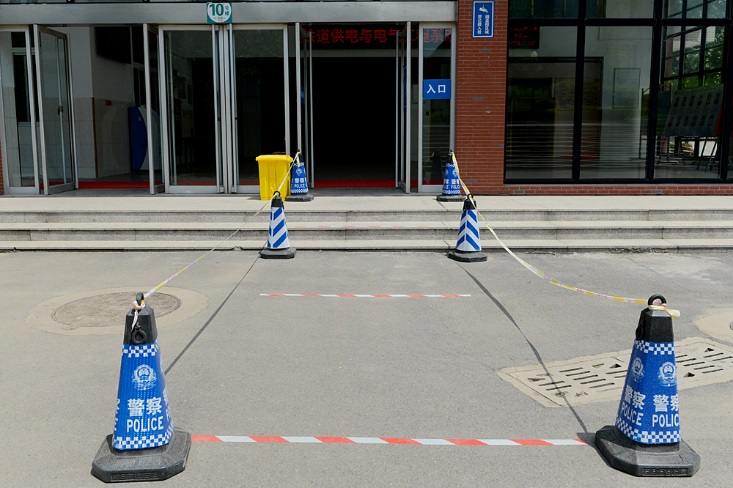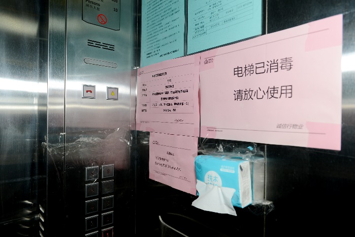 在教学区,每栋教学楼前都设置了隔离带和隔离条,安排专人进行体温检测,保障学生安全有序进入。图书馆门口安置了电子测温仪进行实时测温监控,馆内电梯每天都会用84消毒液和酒精消毒两次,每天都会更换电梯按键板保护膜,电梯间、电梯内准备了专用抽纸,一层电梯口放置了消毒用品。