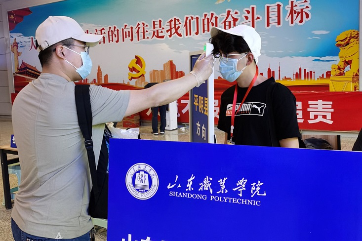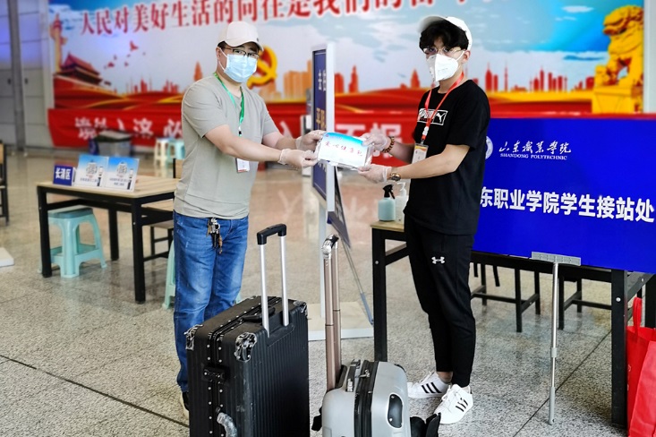 学院在济南火车站等设置了接站点,实行专人包干接站。经过信息核对、健康扫码、消毒杀菌、体温检测后,接站的老师为每一名学生送上爱心健康包,其中包括一次性医用口罩、消毒湿巾、消毒手套以及《新型冠状病毒肺炎防控指南》《疫情防控学习生活指南》《疫情防控心理健康指南》等,并帮助他们搬运行李,安排专车送至学校。