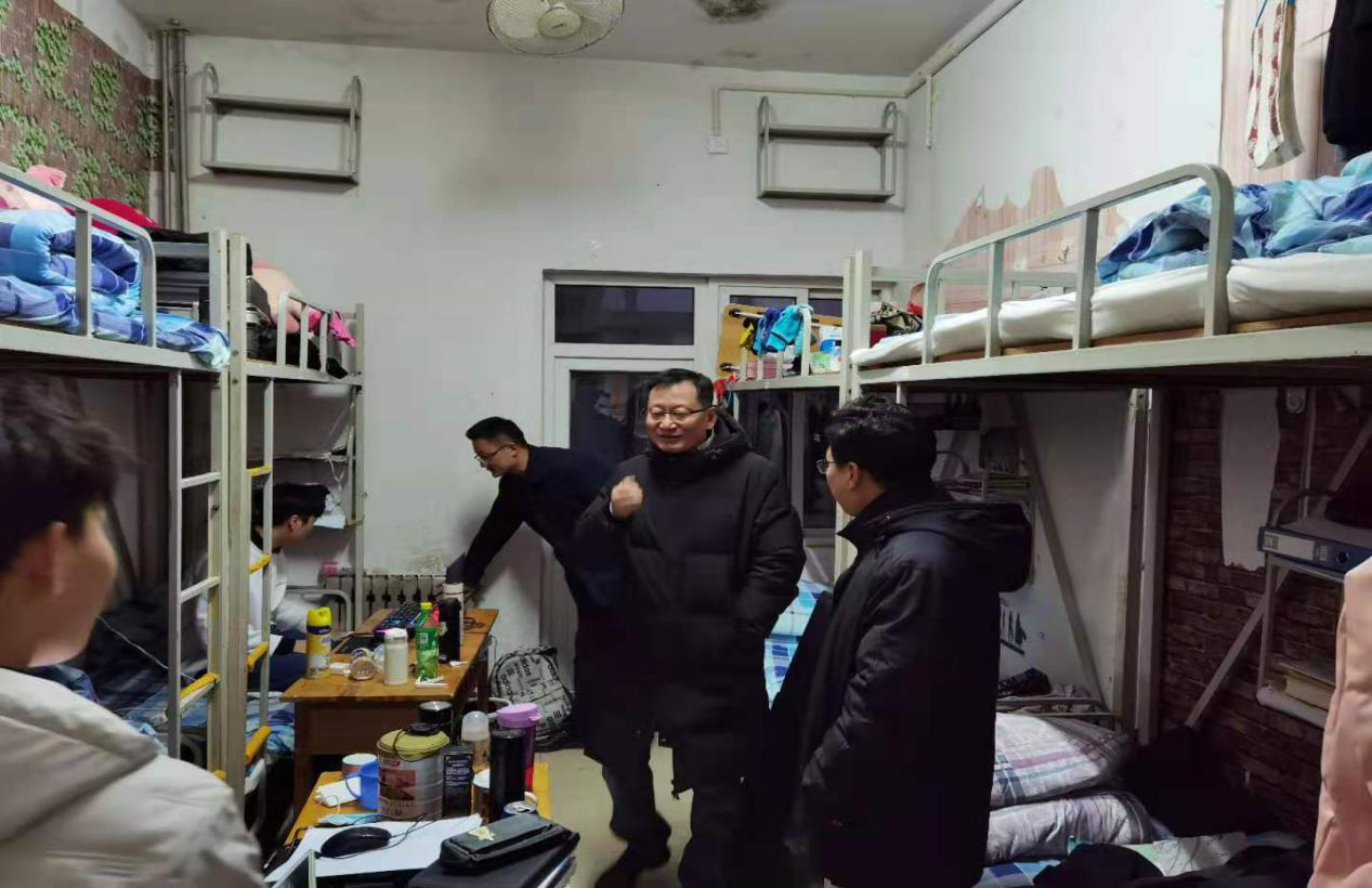 在学生公寓,郭培谦与学生拉家常、问冷暖,并通过触摸暖气片体验宿舍供热效果。叮嘱同学们留意天气变化,从事户外活动及时添加衣物,注意做好御寒保暖。