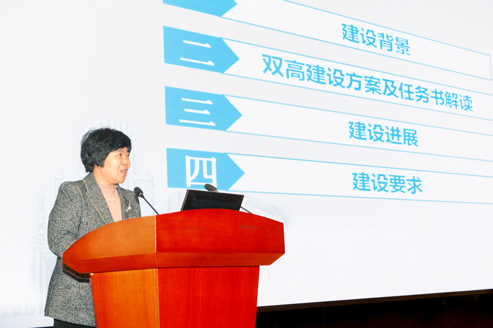 副院长祝瑞花以《“双高建设•创新发展高地建设•提质培优行动”目标任务解读》为题作了主题报告。重点介绍了项目建设背景,详细阐述了“双高”建设方案,认真梳理了重点项目任务,厘清了“双高建设”“创新发展高地建设”与“提质培优行动”的关系,系统总结了目前项目的建设进展,并提出了下一步“双高”建设要求。