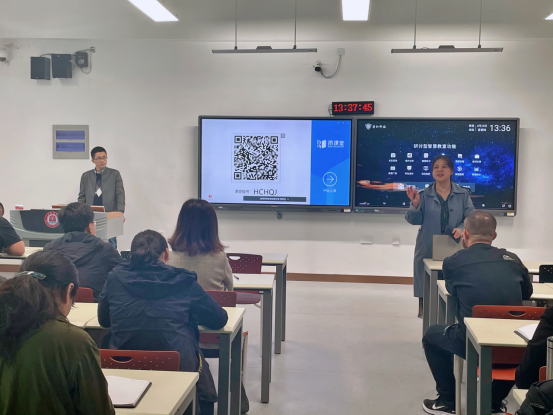 吕绪法对在线课程发展现状、平台背景等进行简要介绍,重点就混合式课程教学理念、教学设计、重构教学模式进行了分享。与会教师认真聆听,并与技术人员就混合式教学设计、教学组织中的遇到的困难以及平台具体操作等进行深入沟通交流。