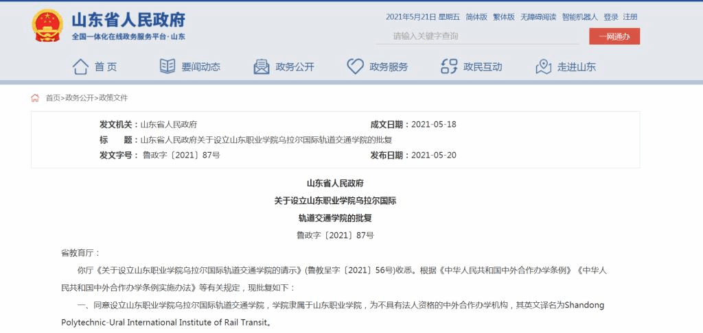 5月20日,伟德betvlctor1949源于英国与俄罗斯乌拉尔国立交通大学联合举办的非独立法人中外合作办学机构“伟德betvlctor1949源于英国-乌拉尔国际轨道交通学院”,获山东省人民政府正式批复。