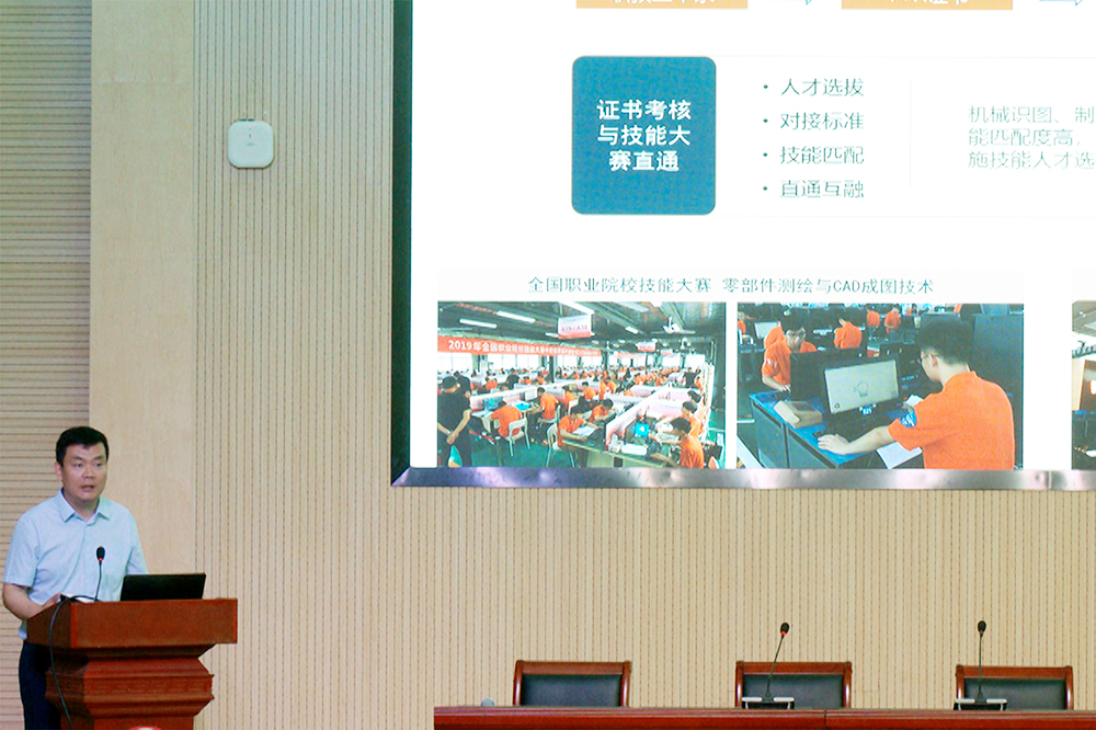 中望软件教育发展部技术总监张亚龙作了题为《“1+X”机械产品三维模型设计职业技能等级标准解读》的报告,主要从证书概况、试点工作实施、证书核心竞争力、公司介绍等四个方面进行了解读。