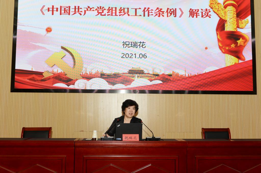 祝瑞花简要介绍了《中国共产党组织工作条例》出台背景和条例概述,详细解读了党的组织体系建设、干部工作、人才工作等条例内容,并结合学校实际就如何贯彻落实好《中国共产党组织工作条例》提出具体要求。
