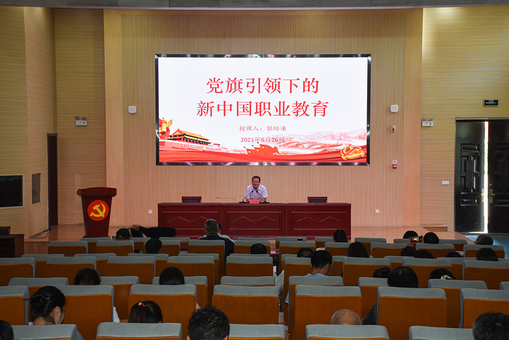 6月26日下午,副院长郭培谦在图书行政楼东报告厅以《党旗引领下的新中国职业教育》为题讲授专题党课。有关职能处室、二级学院、书院党员参加。