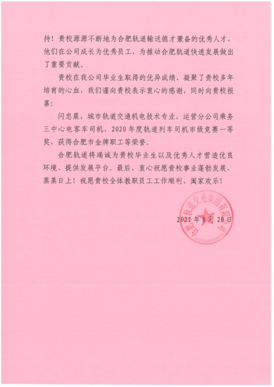 近日,伟德收到一封来自合肥市轨道交通集团有限公司的感谢函。