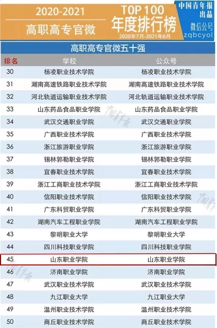 近日,在《中国青年报》发布的《2020-2021高职高专官微年度排行榜》中,伟德官方微信公众号荣获2020-2021年度全国高职高专官微五十强。