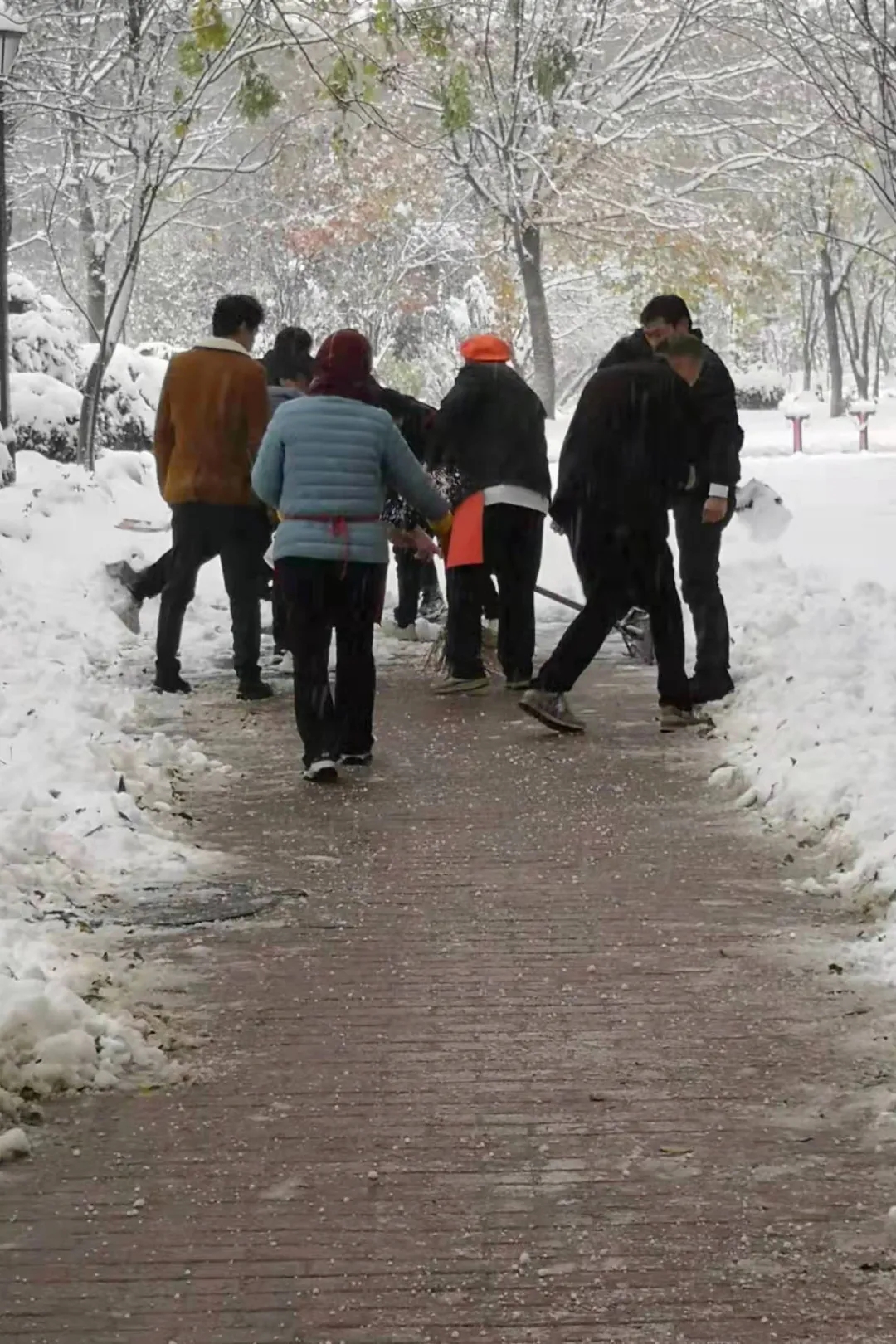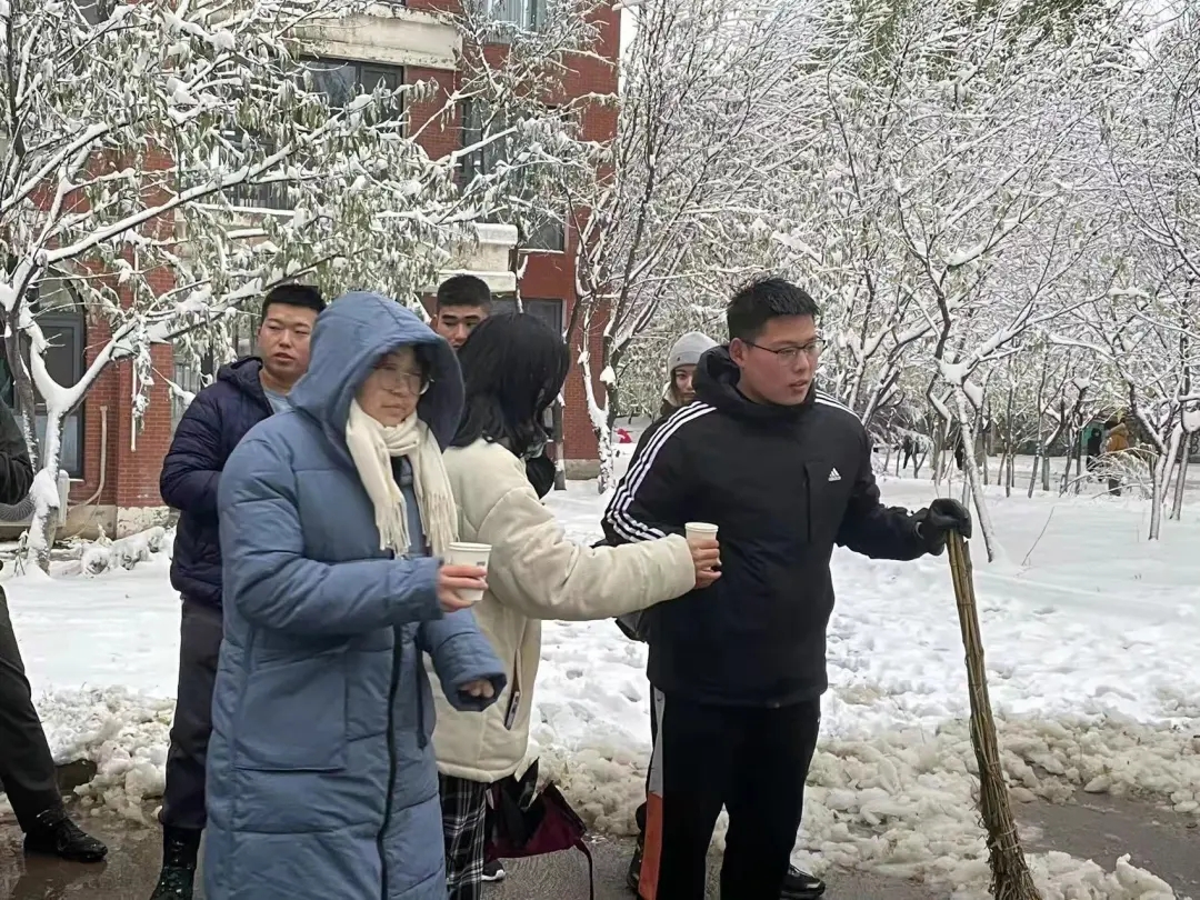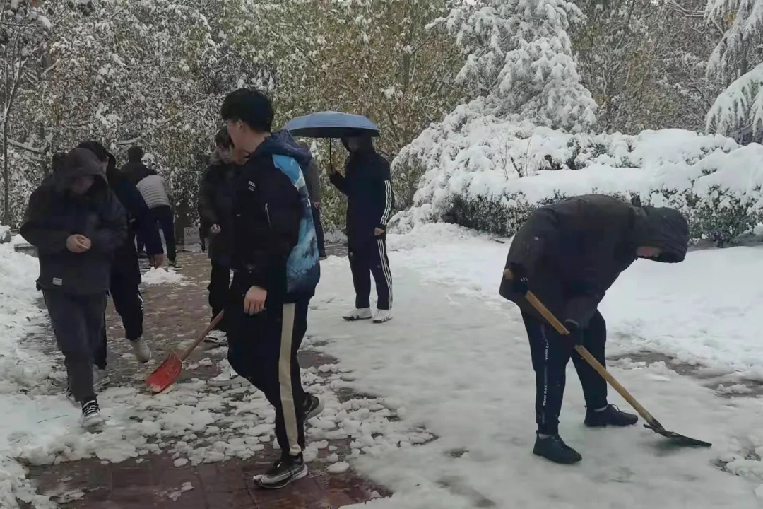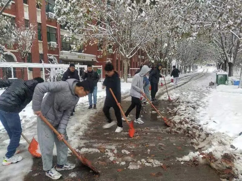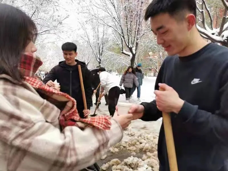 各书院学生也积极加入到大雪清理队伍中来,清理积雪。看还有赤膊上阵的同学,同学们,你们辛苦了!