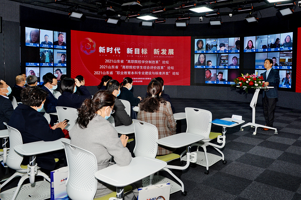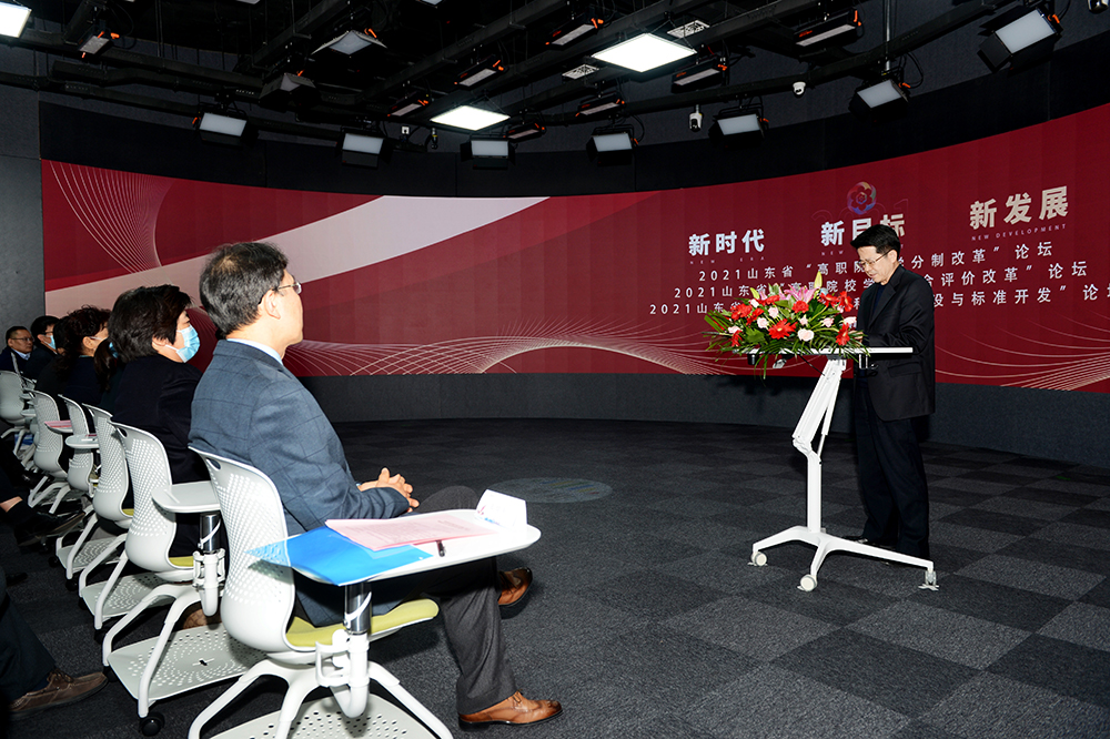 11月18日上午,由齐鲁职业院校校长联席会议主办、伟德承办的山东省“职业教育本科专业建设与标准开发论坛”“高职院校学分制改革论坛”“高职院校学生综合评价改革论坛”三个论坛在伟德新建成的全景教室开幕。院长秦河致欢迎辞,省教育厅职教处副处长陈志浩出席并讲话,全省各高职院校领导、教育教学管理人员、学生管理人员、专业带头人、骨干教师等通过线上线下相结合的方式参加论坛。开幕式由副院长王绍军主持。