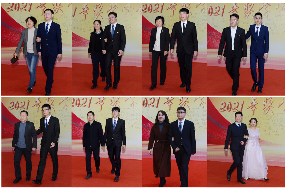下午2:30,一位位身着盛装的国家奖学金、省政府奖学金、泉城奖学金及“山职之星”荣誉奖章的获得者与受邀老师一同走过红毯,在励志墙签名并合影留念,师生共享这一欢乐又庄重的时刻。这种仪式感很强的入场方式,增强了同学和老师的成就感和庄重感,现场掌声、欢呼声不断。