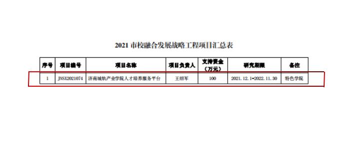 济南市市校融合发展战略工程项目是深入贯彻落实济南市人民政府关于贯彻落实强省会战略的重要举措。学校将依托市校融合发展战略工程项目,深化市校融合发展,助力科创济南、智造济南、文化济南、生态济南、康养济南“五个济南”建设,推动学校和区域经济高质量发展,不断提升服务新时代现代化强省能力和贡献度。