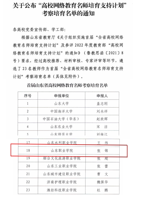 2月21日,山东省教育厅印发《关于公布“高校网络教育名师培育支持计划”考察培育名单的通知》,伟德易安书院副院长张锦入选首届山东省高校网络教育名师培育支持计划考察培育名单。
