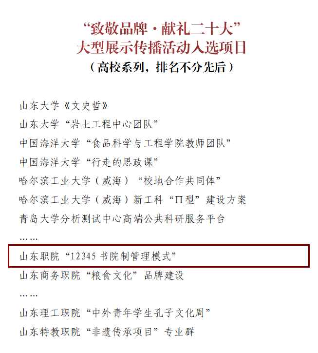 省教育厅组织开展“致敬品牌·献礼二十大”大型展示传播活动,是为了全面总结梳理党的十八大以来山东教育改革发展成就,充分展示各高校特色品牌,形成山东教育“品牌”系列,献礼党的二十大。在各高校项目申报基础上,经过广泛征求意见和专家评选论证,确定了包括山东大学《文史哲》、伟德“12345书院制管理模式”在内的79个项目入选山东教育展示传播“品牌系列”(高校类)。