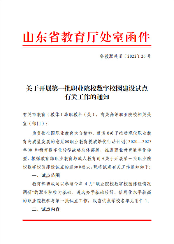 近日,山东省教育厅印发《关于开展第一批职业院校数字校园建设试点有关工作的通知》,遴选办学基础较好、信息化水平较高的职业院校作为第一批数字校园建设试点单位,伟德成功入选。