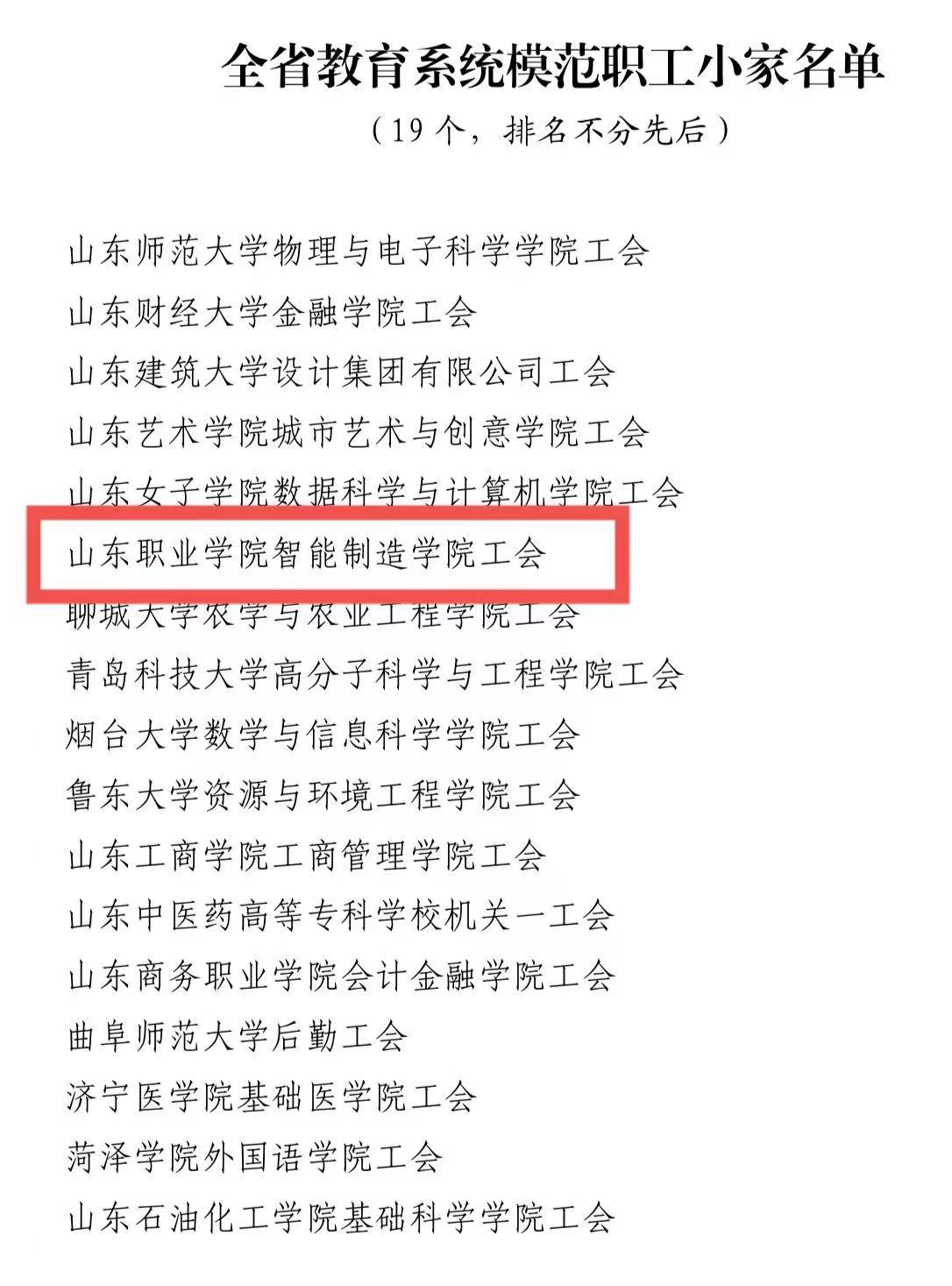 近日,山东省教育工会下发了《关于通报表扬全省教育系统模范职工之家模范职工小家和优秀工会工作者的决定》(鲁教工〔2022〕20号),伟德智能制造学院支会荣获山东省教育系统“模范职工小家”荣誉称号。