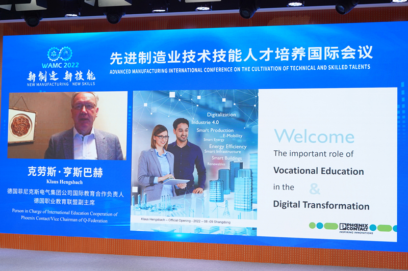山东省教育厅职业教育处处长王志刚;德国巴登符腾堡州教育部专家、德国戈特利布·戴姆勒学院数据科学学院院长安德烈亚斯·威尔斯坦;德国菲尼克斯电气集团公司国际教育合作负责人/德国职业教育联盟副主席克劳斯·亨斯巴赫;中国智能制造专委会专家/e-works数字化企业网总编、CEO 黄培;德国菲尼克斯电气中国公司副总裁、总工程师/中国自动化学会理事杜品圣;美国普渡大学材料科学与工程专业教授王晓明;德国国家科学与工程院院士葛兴福通过线下与线上方式作了精彩的专题报告。