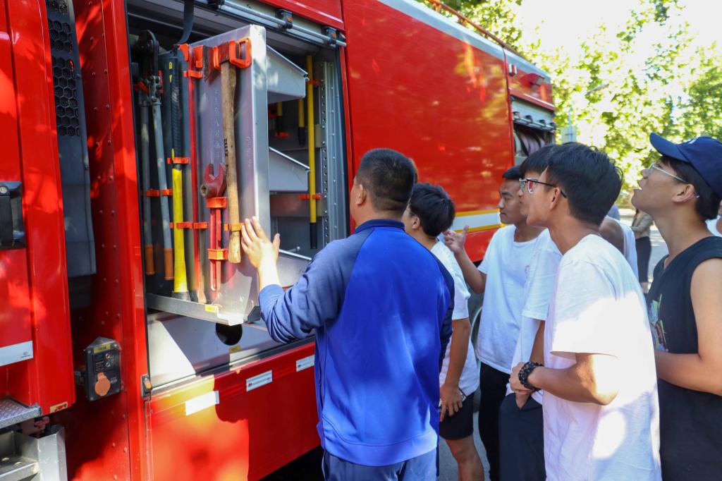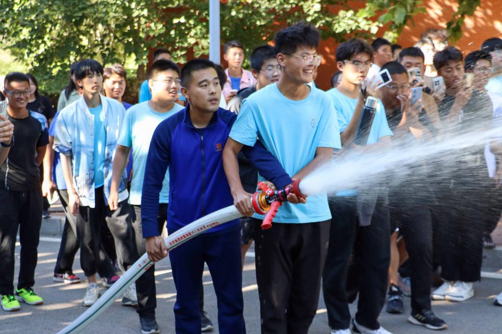 为更加直观形象地了解消防车是如何灭火的,学校还邀请到济南市高新区孙村消防救援站几位消防队员,向大家详细讲解了水罐消防车、泡沫消防车、抢险救援消防车的区别,并现场利用水罐消防车,介绍了水罐消防车上各类设备的名称和使用方法。学生代表与消防队员亲切互动,进行了消防水带喷水演练。