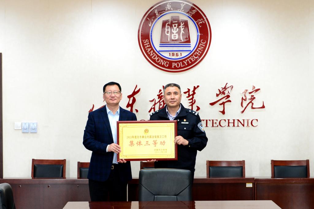 近日,济南市公安局印发了《关于表彰2021年度全市单位内部治安保卫工作先进集体和先进个人的决定》(济公〔2022〕26号),对2021年度全市单位内部治安保卫组织和保卫人员进行了表彰,伟德安全保卫处荣立“集体三等功”。10月25日上午,济南市公安局经文保支队三大队队长于平专程到校颁发立功奖匾并进行座谈,党委副书记郭培谦出席座谈。