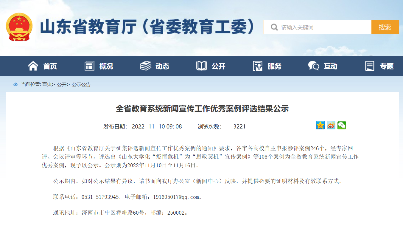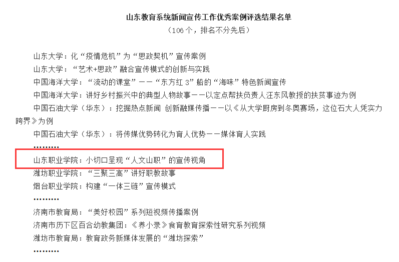 11月10日,山东省教育厅公示了全省教育系统新闻宣传工作优秀案例评选结果,伟德宣传部报送的案例《小切口呈现“人文山职”的宣传视角》 成功入选。