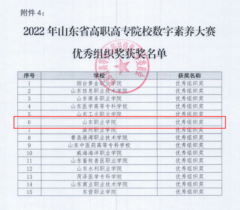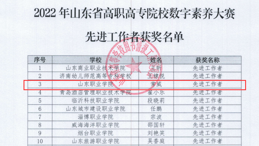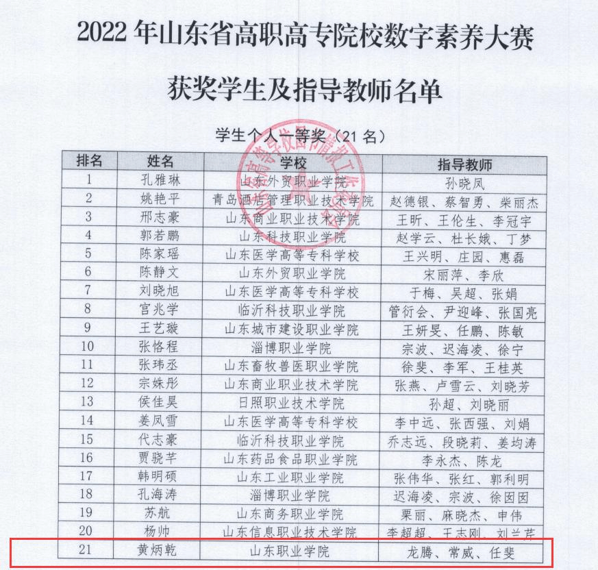 为做好比赛备战工作,学校积极部署,选派常威、龙腾、任斐等六名教师担任指导教师,对学生进行全方位指导。最终,龙腾、常威和任斐指导的黄炳乾获得一等奖;常威、龙腾和孙娜指导的李骁哲获得二等奖;常威、龙腾、卢颖立指导的高文哲、张梓豪获得三等奖。学校获得2022年山东省高职高专院校数字素养大赛优秀组织奖,常威获大赛先进工作者殊荣。
