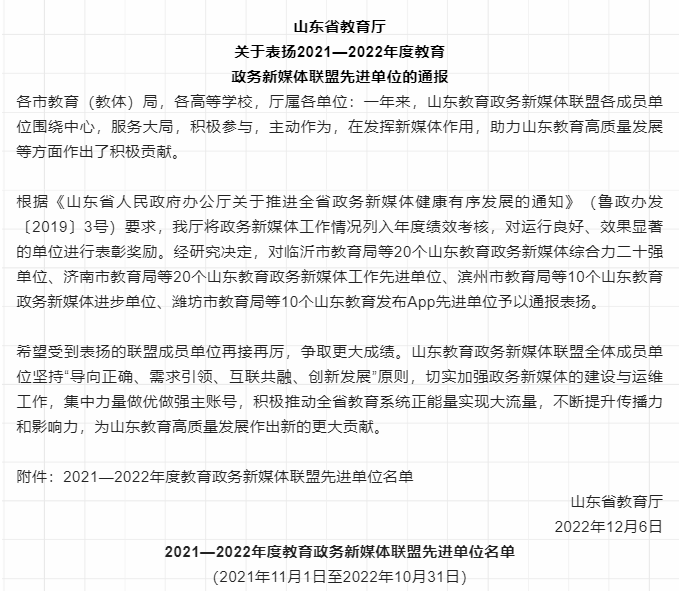 12月7日,山东省教育厅发布《山东省教育厅关于表扬2021-2022年度教育政务新媒体联盟先进单位的通报》,伟德荣获“山东教育政务新媒体工作先进单位”荣誉称号。自2017年山东教育政务新媒体联盟成立以来,伟德已连续五年获此殊荣。