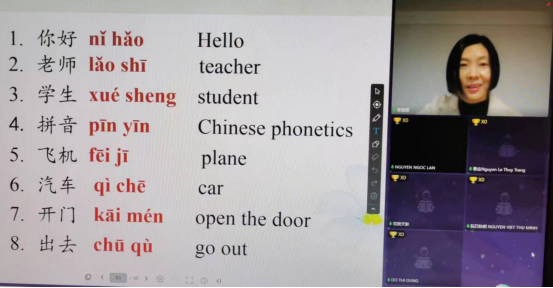 本次课程中,张慧丽老师带领学生进行汉语拼音的学习,通过一些常用且基本涵盖23个声母和24个韵母的汉字和词语,同时借助类似的英语发音,讲解声母、韵母、声韵拼合与四声调。