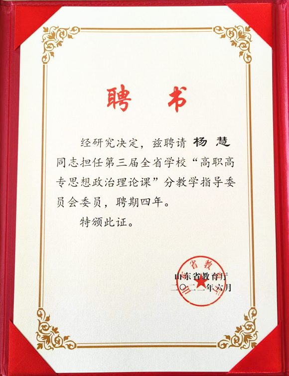 杨慧同志当选全省学校“高职高专思想政治理论课”分教学指导委员会委员,充分彰显省教育厅(省委教育工委)、同类院校对学校思政课内涵建设及改革创新的高度认可。