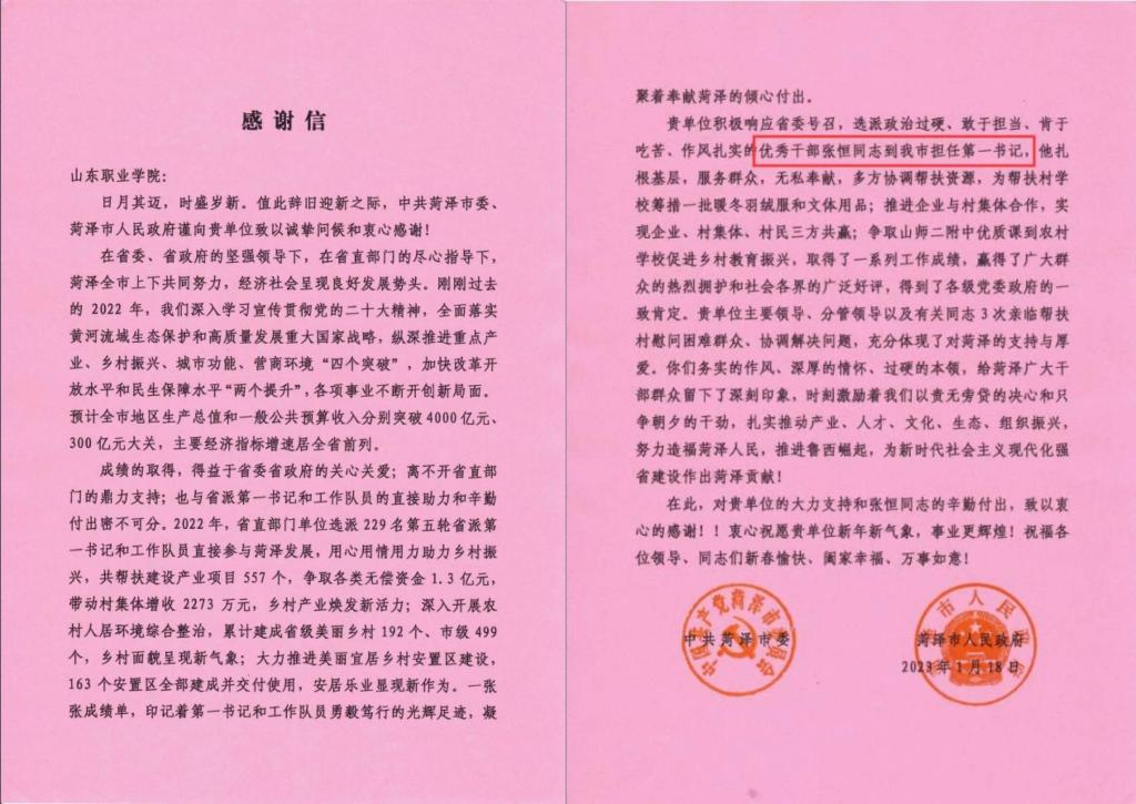 感谢信中表示,学校选派的张恒同志自驻村以来,扎根基层、服务群众、无私奉献,多方协调帮扶资源,帮扶村学校筹措物品、争取优质课促进乡村教育振兴,推进企业与村集体合作,取得一系列的成绩,受到广泛好评。学校领导多次亲临帮扶村慰问困难群众、协调解决问题,充分体现了对菏泽的支持与厚爱。