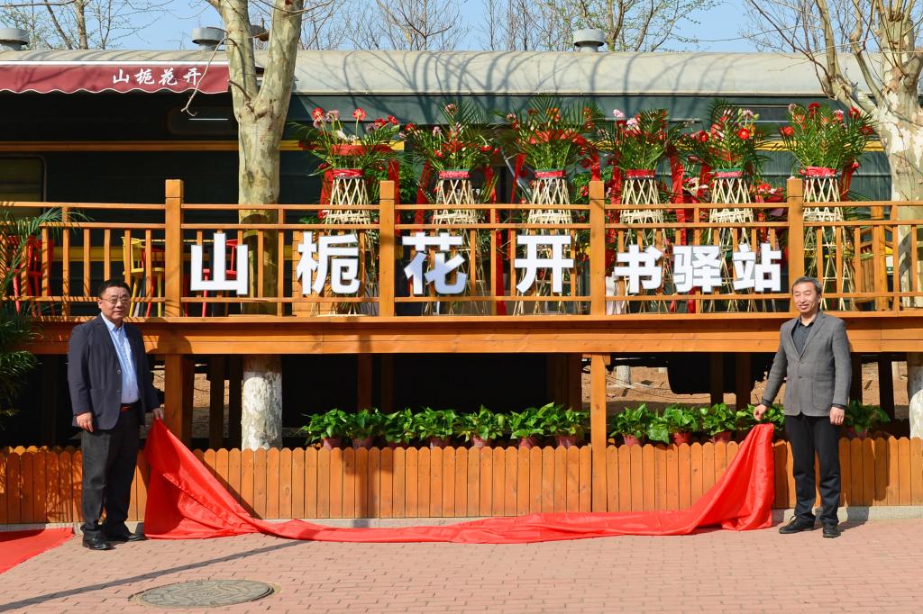 郭鹏和魏立文共同为“山栀花开”书驿站揭牌,标志着我国首家以实体多规格车厢为载体的火车书吧正式启用。