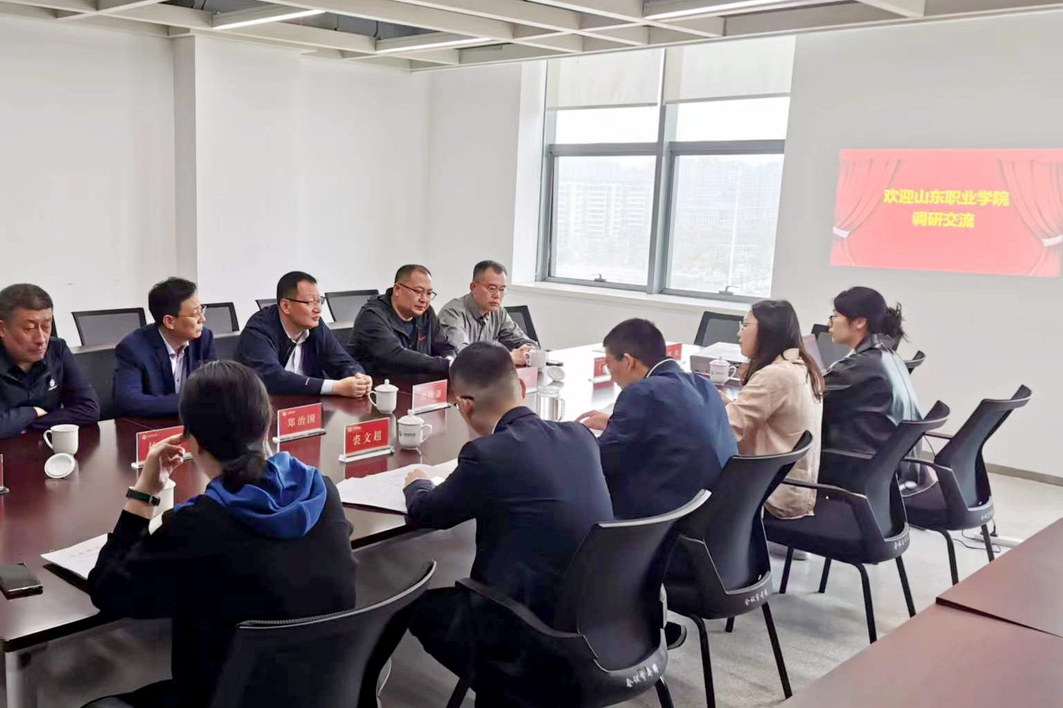 在宁波轨道交通集团有限公司,调研团与运营中心副总经理孙晋敏、人资部长裘文超、订单班专员徐静静、学校毕业生代表进行座谈。双方就产教融合、岗位拓展、订单培养、校园招聘、毕业生成长、职业稳定性等内容深入交换了意见,形成了一系列校企深度融合、互惠共赢的共识。