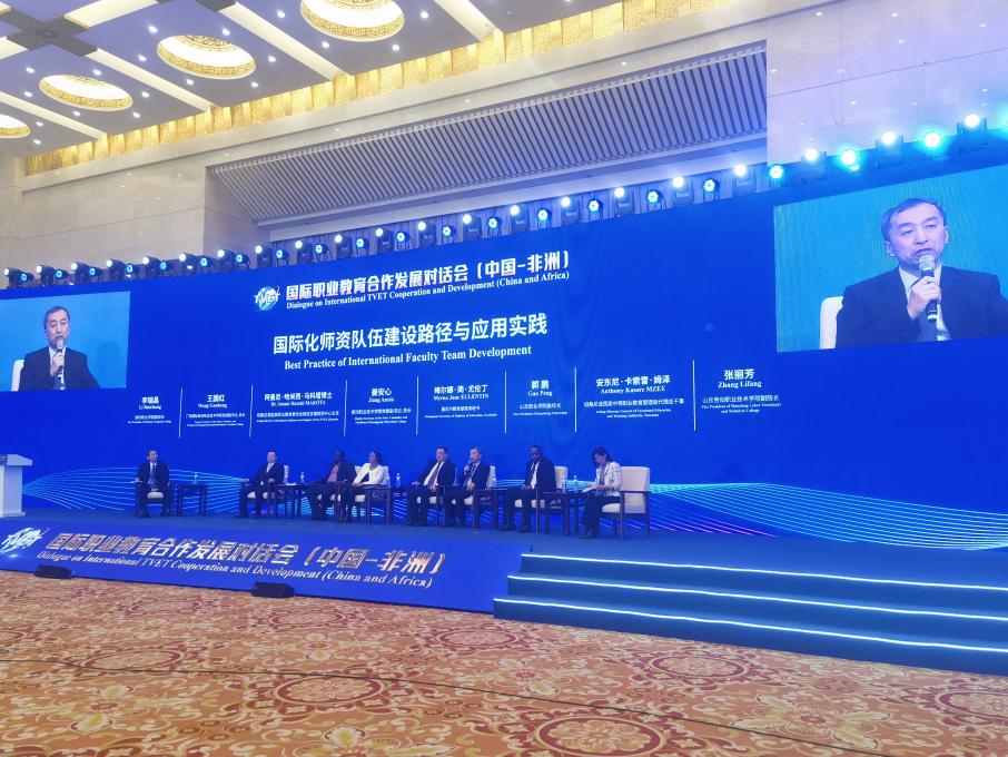 4月28日,国际职业教育合作发展对话会(中国-非洲)在济南成功举办。会议以“新机遇·新发展,中非携手·共赢未来”为主题,山东省副省长邓云锋,外交部非洲司参赞王菊,教育部国际司副司长贾鹏,山东省教育厅副厅长孙晓筠,中智集团党委书记王晓梅,埃塞俄比亚劳工部国务部长亚德萨,塞舌尔教育部首席秘书莱斯佩兰斯和坦桑尼亚教育、科学与技术部副部长基潘加出席对话会,山东省委外办主任、省对外友协会长蔡先金主持会议开幕式。副院长郭鹏应邀参加会议并作经验分享。