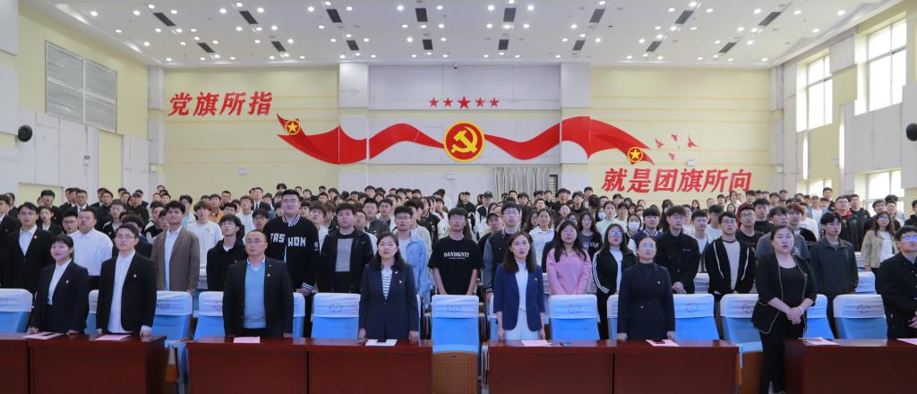 在团委王震老师的带领下,新团员面向团旗整齐列队,举起右拳庄严宣誓。百余名老团员重温了入团誓词,誓言铿锵有力、激情豪迈。