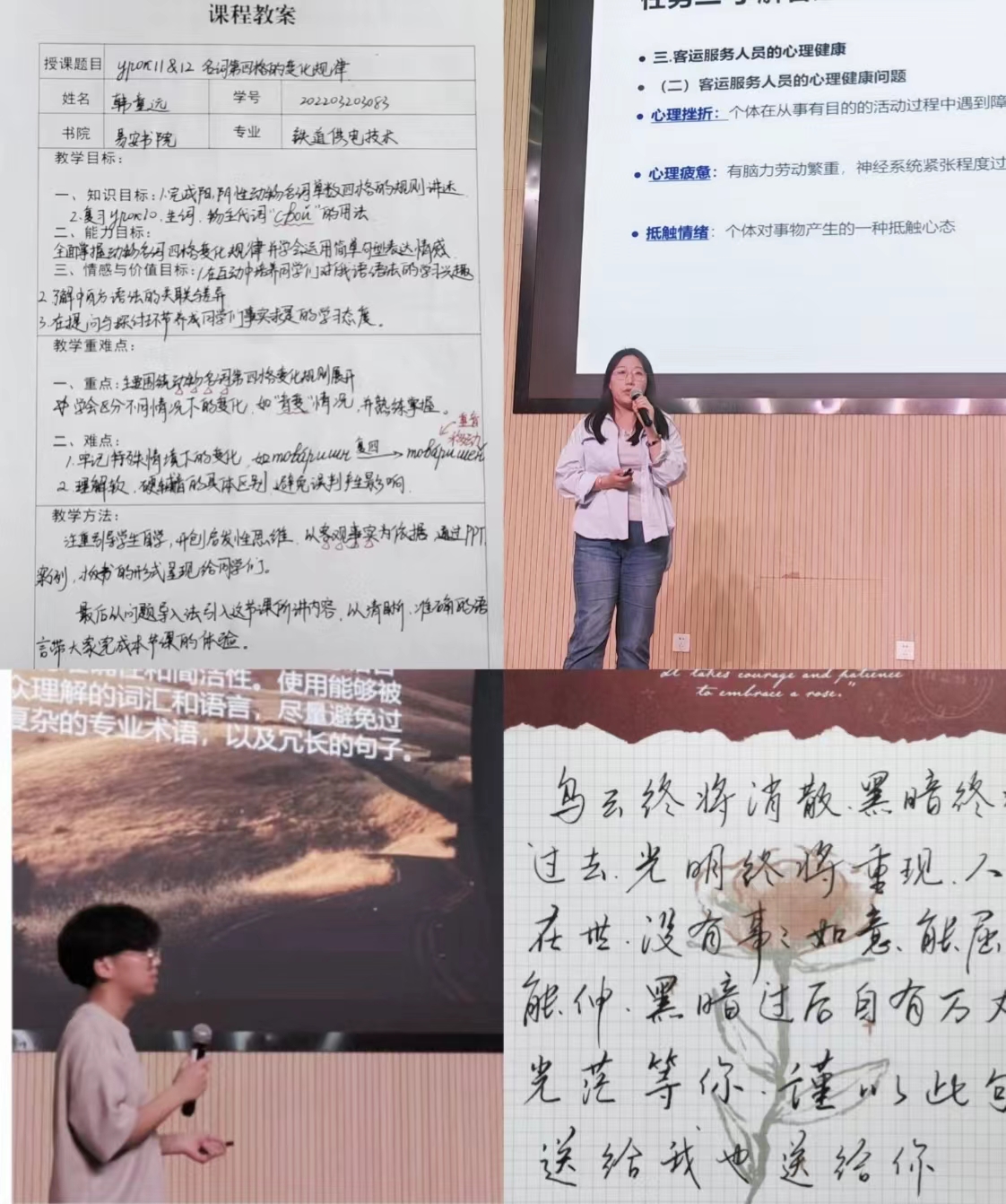 展现专业风采,扬起成功风帆。同学们根据自己喜欢的一节专业课,设计教案,模拟授课,他们略显稚嫩但饱含深情、逻辑清晰的讲述,既锻炼了语言表达能力,又提升了专业认知水平;同学们亲手摘抄的梦中“情话”,无论是积极向上的语言文字还是情感表达,充分展现新时代大学生积极向上的时代风貌。