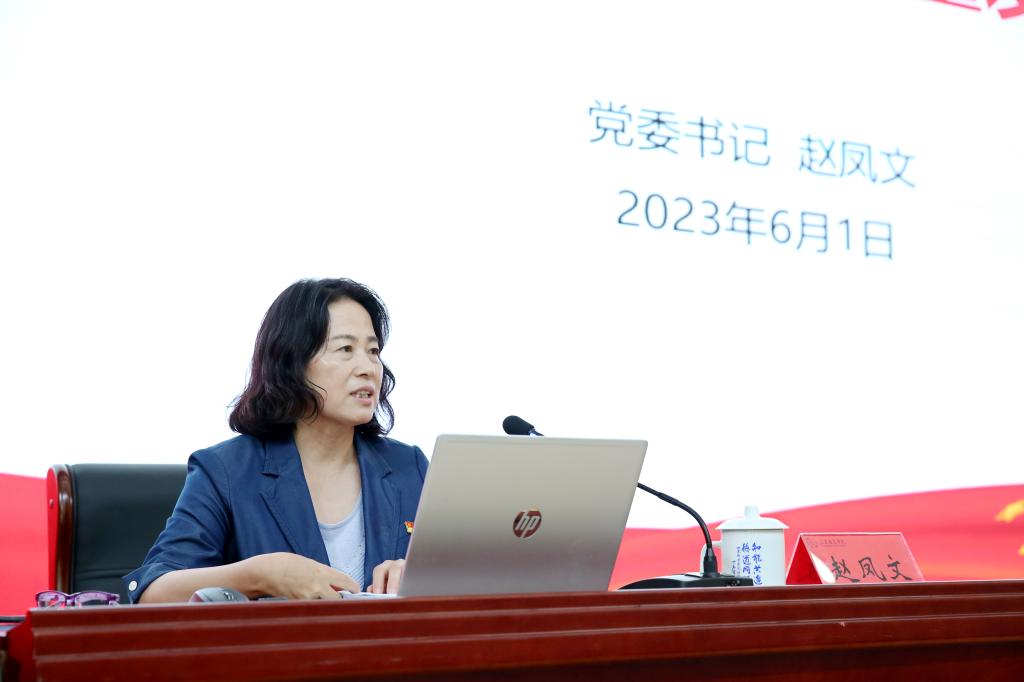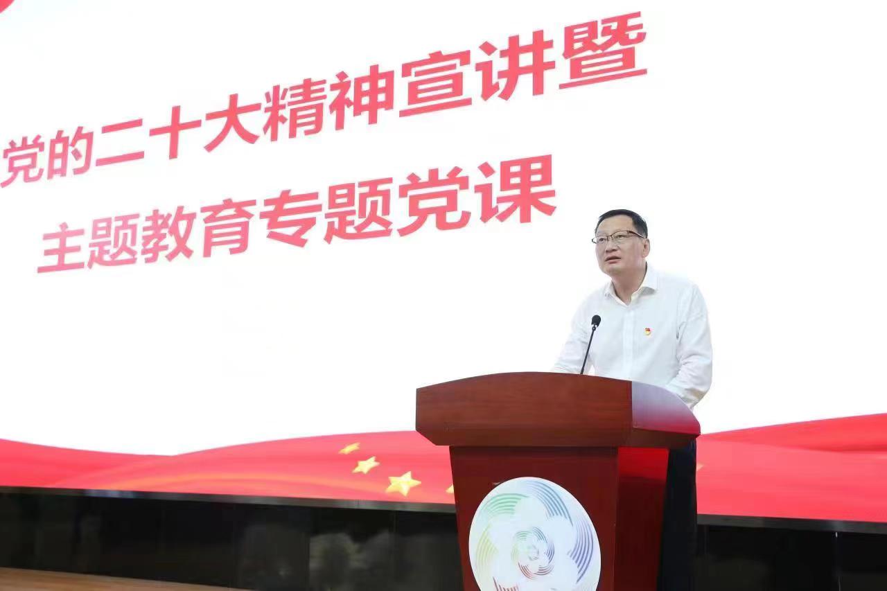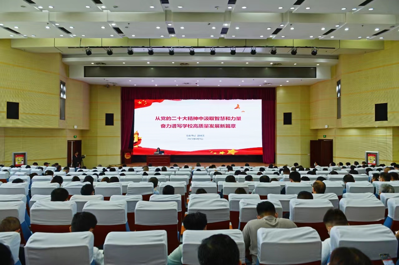 赵凤文以“从党的二十大精神中汲取智慧和力量奋力谱写学校高质量发展新篇章”为题,结合自身学习,联系学校实际,围绕“党的二十大的主题、主要成果”“过去5年的工作和新时代10年的伟大变革”“新时代10年来教育事业取得的巨大成就”“敢想敢为、善作善成,全力推动学校工作走在前、开新局”四个方面作了系统讲解和深入阐释。