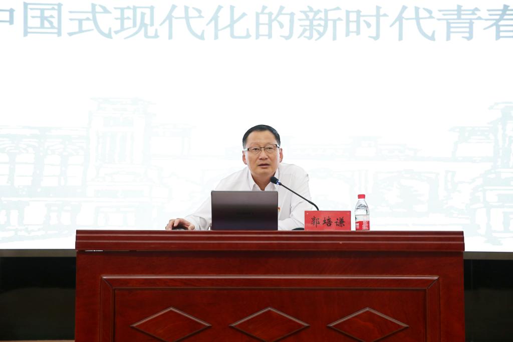 郭培谦以《中国式现代化理论阐述与新时代的青春担当》为题,从中国式现代化理论体系的观念基石、中国式现代化理论体系的历史变革、中国式现代化理论体系的理论硬核、习近平总书记对青年的青春寄语、中国式现代化的新时代青春担当等五个方面进行了详细讲解和理论阐述。